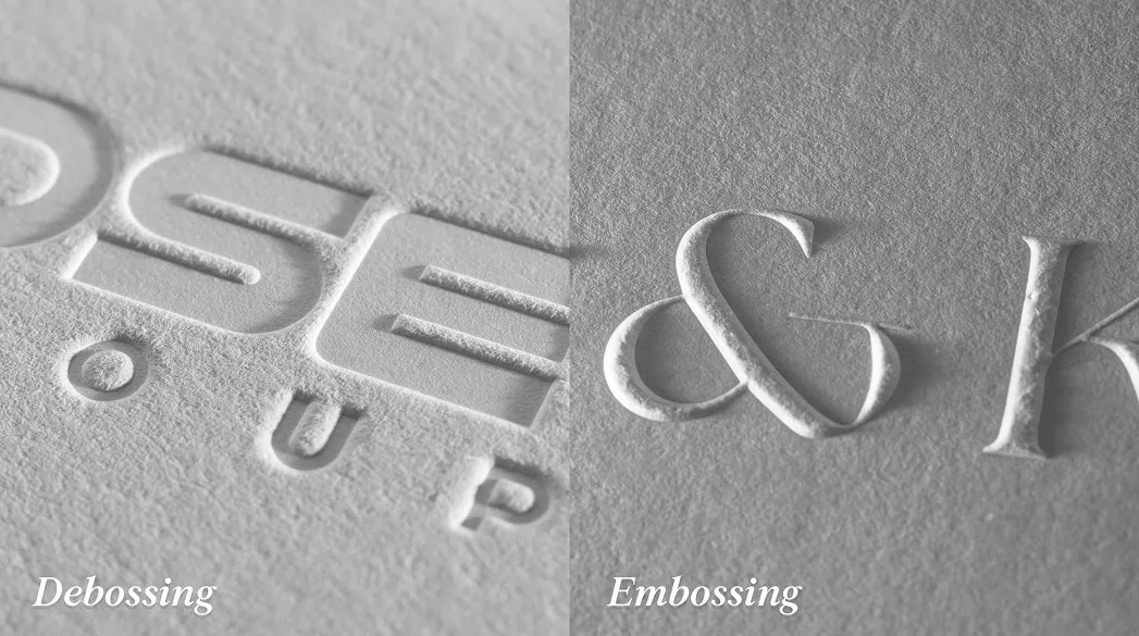 by creating a raised area using a die, blind (or inkless) embossing creates a subtle paper coloured image that can be felt as well as seen. debossing uses the same technique but creates an indentation. this can be as emphatic or delicate as the graphics or words dictate.