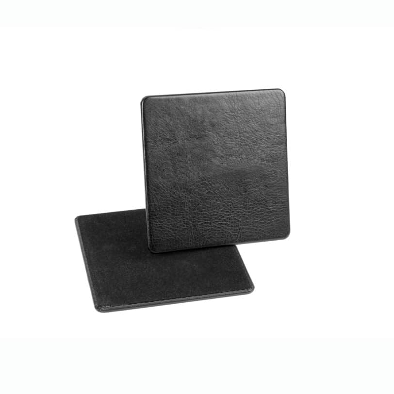 Rigid square coaster with folded edges and felt backing. Designed for hospitality environments to protect surfaces while maintaining a clean, professional appearance.